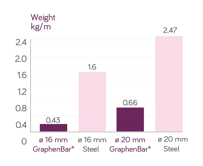 Graphenbar® FRP reinforcement bars have only about 27% of the weight of steel reinforcement bars. This allows for lighter structures with maximum stability and reduced dead load, as well as much easier handling on construction sites.