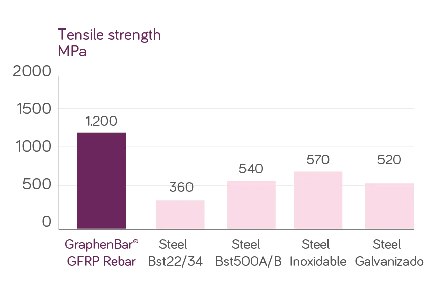GraphenBar® does not oxidize or degrade in contact with water, chlorides or aggressive chemical agents